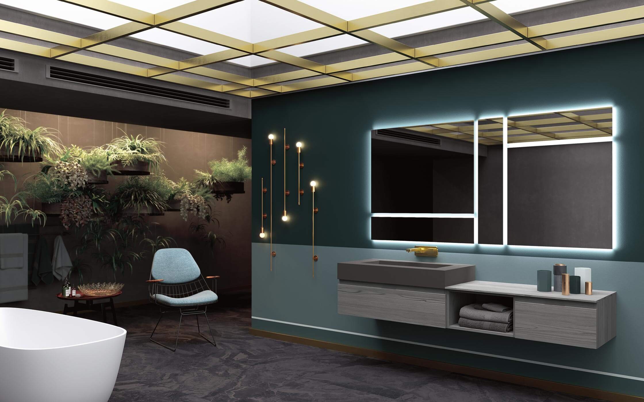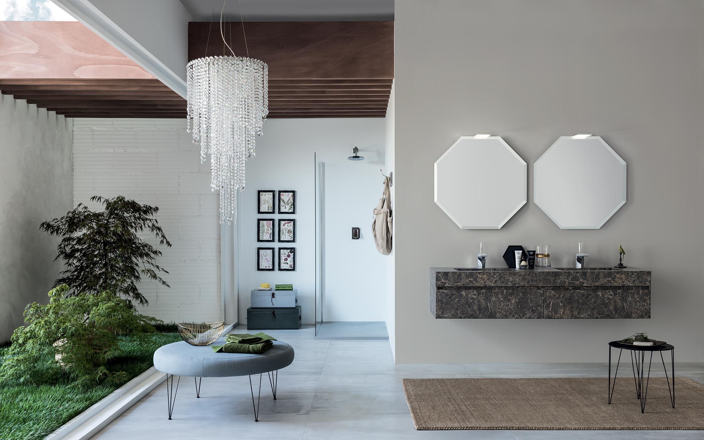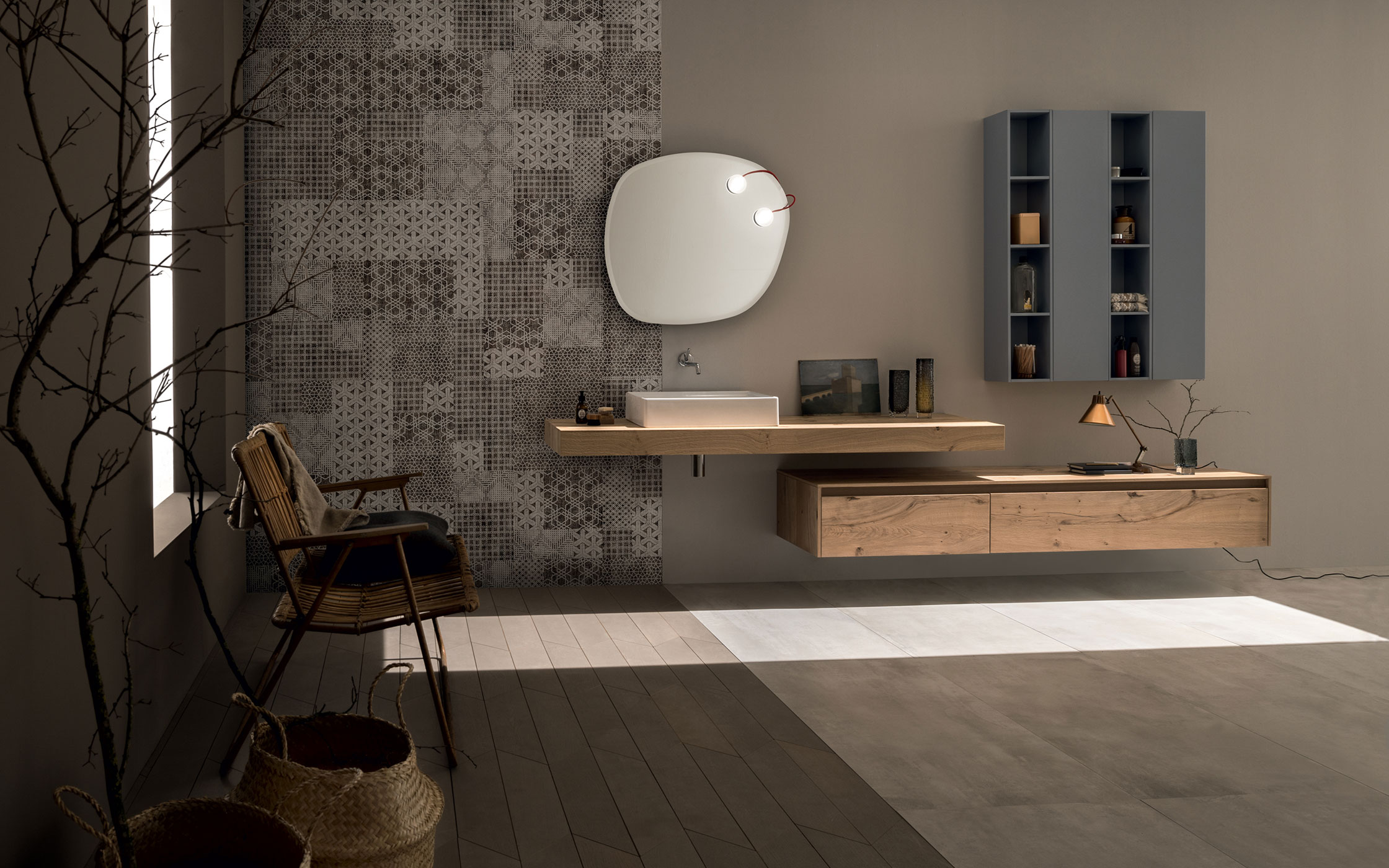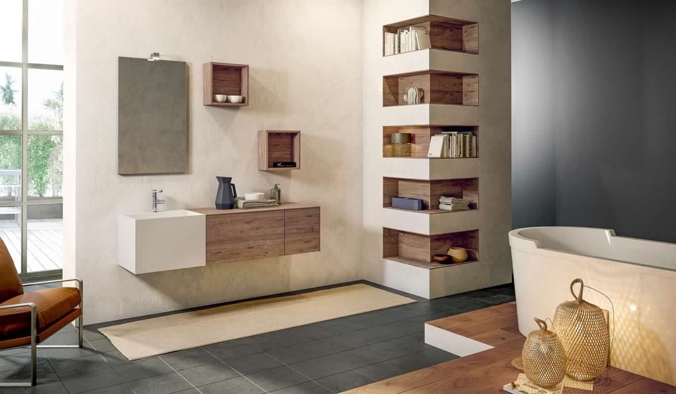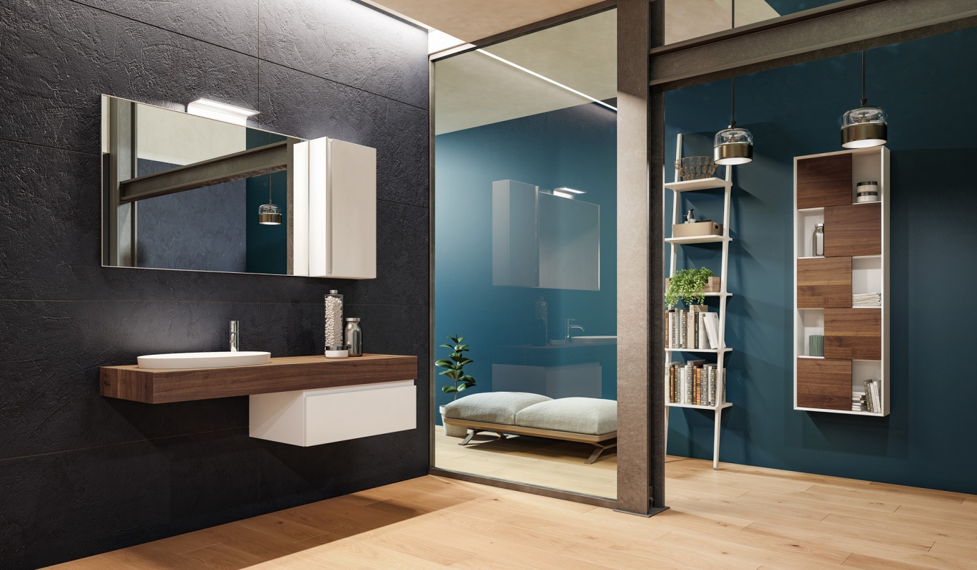 L'idea? Saper guardare oltre il bagno per creare un arredo unico e personale che dialoga con lo spazio circostante. Sperimentare nuovi accostamenti di forme e materiali. Un dinamico movimento grafico l'alternanza tra piani, volumi, spessori e materiali diversi definisce la composizione; una soluzione flessibile e altamente personalizzabile.